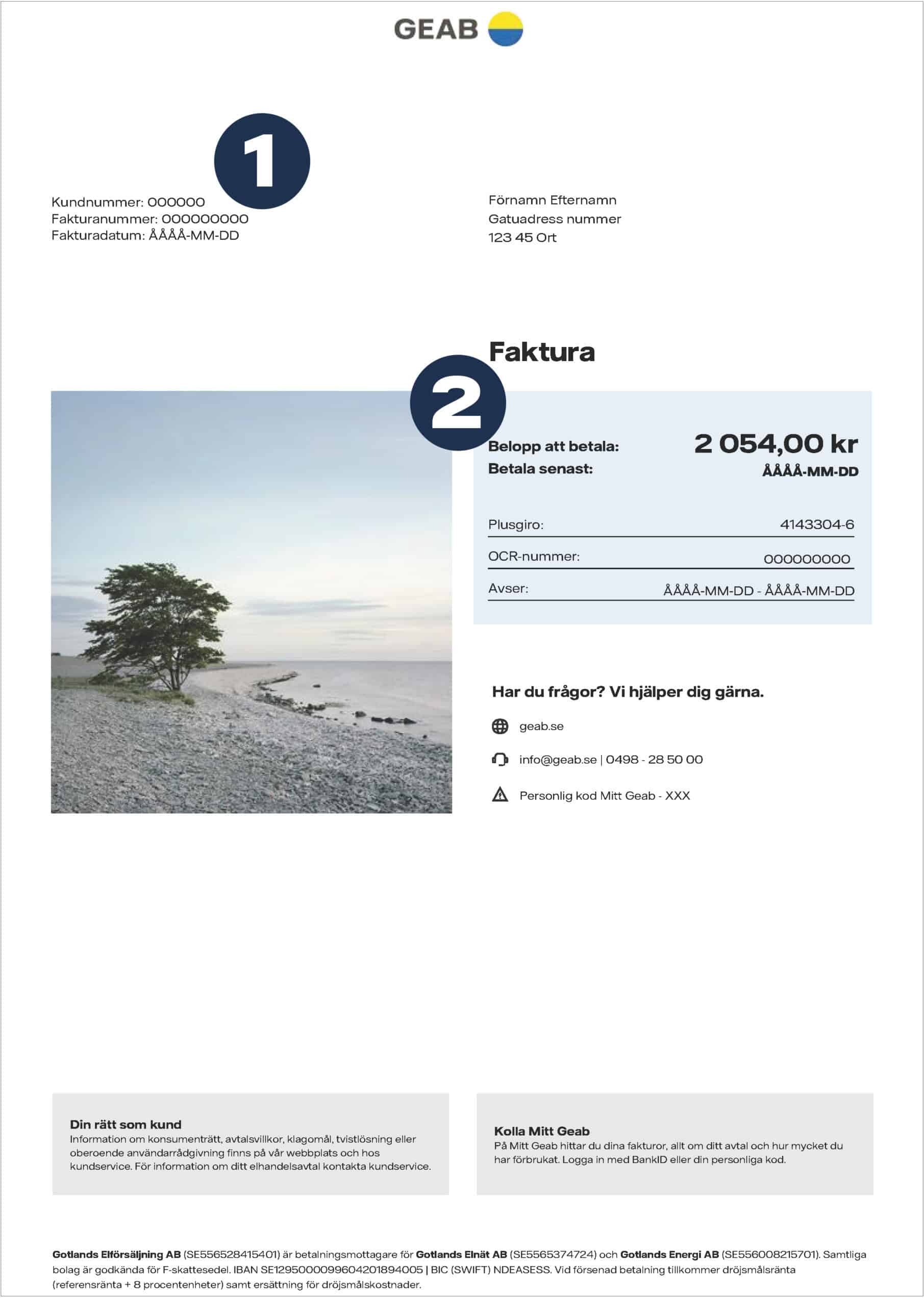 Ditt kundnummer, fakturanummer, fakturadatum och fakturaadress.